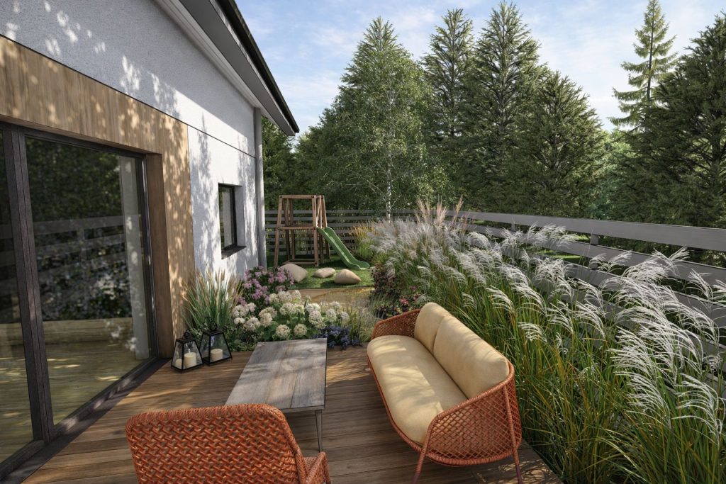 Część ogrodowa za domem jest kameralna i świadomie ograniczona. Na niewielkiej powierzchni zaplanowano taras na ciepłym, drewnianym podeście – miejsce codziennego odpoczynku, rozmów i obserwowania dzieci podczas zabawy. Z tarasu rozciąga się widok na strefę dziecięcą z bezpiecznym miejscem do wspinania i zjeżdżalnią, zaprojektowaną tak, aby była widoczna, ale nie dominująca.