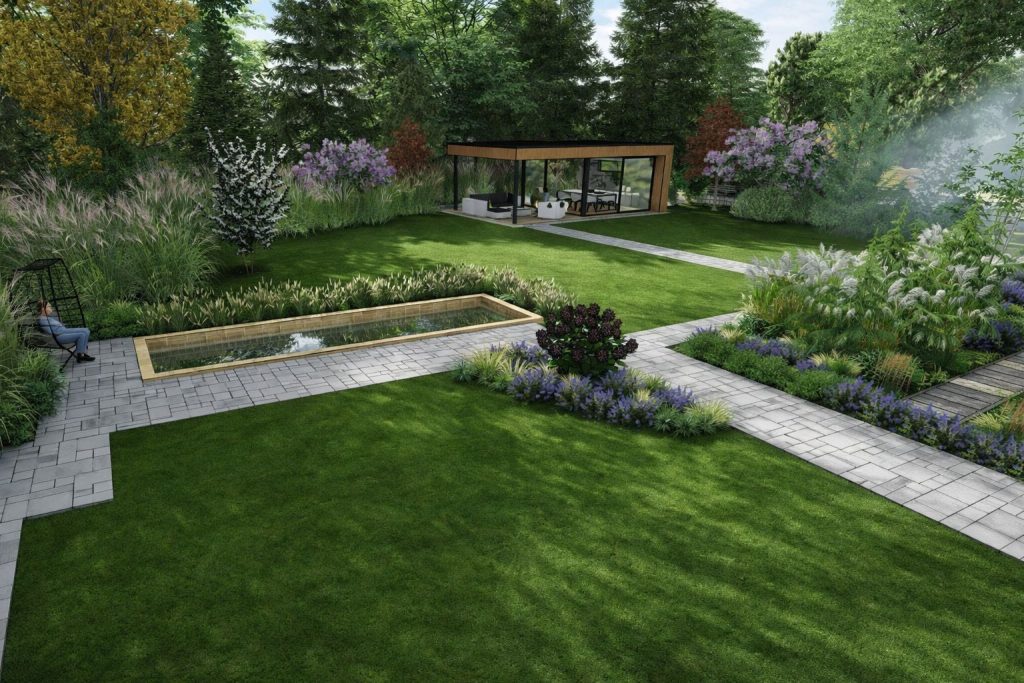 Centralnym elementem koncepcji jest wąski, wydłużony basen o charakterze ogrodowej rzeki. Zaprojektowany jako miejsce pływania i wyciszenia, otoczony zielenią wysoką i trawami ozdobnymi, które zapewniają prywatność i miękkie przejścia między strefami.
