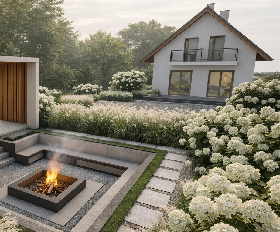 Dobór roślin podporządkowano budowaniu atmosfery spokoju i naturalności. Drzewa zapewniają cień, trawy ozdobne porządkują przestrzeń i tworzą miękkie podziały, a pachnące rośliny podkreślają wypoczynkowy charakter ogrodu.